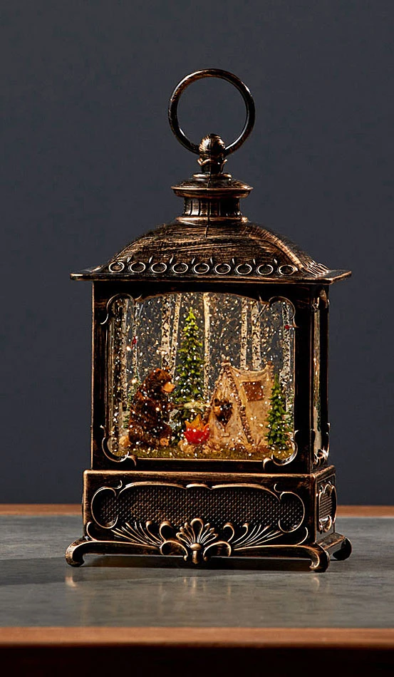 Bears at the campfire scene water lantern. A large bear cooking a fish over a campfire with a bear peaking out of the tent, in swirling glitter with evergreens, birch trees and cardinals in the background. When turned on a warm LED shines on the figurine and swirling glitter to gives our Campfire Christmas globe a whimsical look for the Christmas Holiday season.
